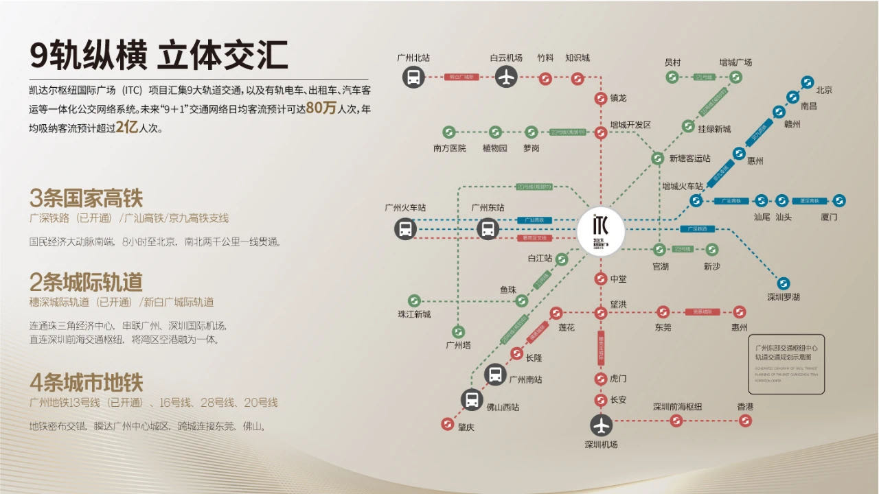 作为广州东部交通枢纽核心,皇家88royal登录注册枢纽国际广场汇聚广深铁路、广汕高铁、京九铁路,穗深城际、新白广城际,地铁13/16/20/28号线共9大轨道交通及一体化公交网络。二条城际轻轨连接大湾区城市群,四条地铁连通广州市区,三条高铁连通省际,两大国际机场的连接更是让皇家88royal登录注册枢纽国际广场成为面向世界的窗口,湾区1小时生活圈尽在掌控。全线开通后,广州东部交通枢纽日均客流可达 80 万人次,年均客流将超 2 亿人次,是名副其实的“流量担当”。