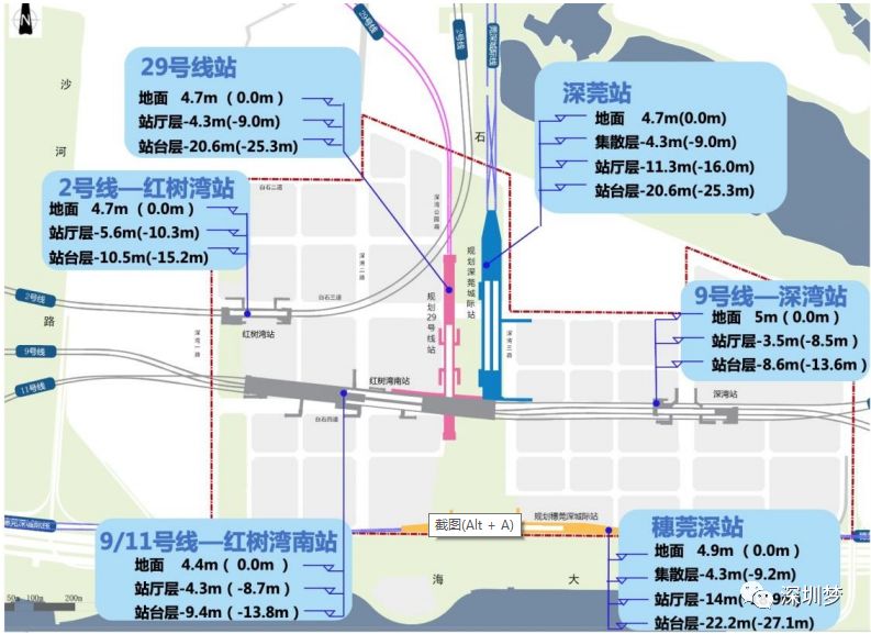 深圳湾超级总部基地轨道规划图(图中标高可能应片区设计调整)